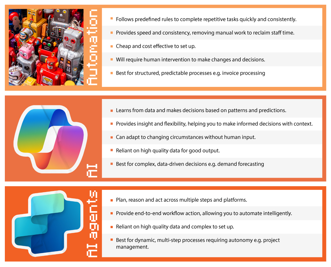 Key takeaways_ AI and automation are often confused, but automation follows fixed rules for repetitive tasks, while AI learns, adapts and handles complexity Use automation for predictable, rule-based processes and AI for tasks needing judgment, pattern recognition or adaptation The best results often come from combining both, using automation for efficiency and AI for insight and innovation, with AI agents enabling autonomy in complex workflows The rapid rise of artificial intelligence, including agentic AI, alongside advanced automation tools is reshaping how organisations operate. Both promise efficiency and innovation, but they’re not the same. And understanding the difference is critical for future-ready businesses. The line between AI and automation is increasingly blurred. Many solutions marketed as “AI agents” are, in reality, sophisticated automation: rule-based systems that follow predefined workflows rather than truly learning or reasoning. This confusion makes it harder for decision-makers to choose the right approach for their business goals. The purpose of this guide is simple: to cut through the noise and help you make informed decisions. We’ll explore the key differences between AI and automation, highlight use cases for each and provide practical guidance on when to deploy one over the other. What’s the difference between AI and automation? The terms AI and automation are often used interchangeably, but they represent fundamentally different approaches to solving business problems. Understanding this distinction is critical, especially as vendors increasingly blur the lines by branding advanced automation as AI. Automation: rules, repetition and predictability_ Automation is about executing predefined tasks with consistency and speed. It follows a set of rules designed by humans and doesn’t deviate from them. This makes it ideal for performing repetitive, structured processes without human intervention, based on fixed logic. Core characteristics include: Rule-based: Operates within strict parameters. Predictable outcomes: Same input and same output every time. No learning capability: Cannot adapt to new scenarios without manual reprogramming. Common examples include Robotic Process Automation and workflow automation. Automation offers high efficiency for repetitive tasks, while eliminating the risk of human error. However, it cannot handle ambiguity or make decisions. It therefore requires human intervention if there is an exception to a rule or if a change is required. Artificial intelligence: Learning, adapting and reasoning_ AI is fundamentally different from automation, because it learns from data and adapts over time. Instead of rigid rules, AI uses algorithms to identify patterns, make predictions and even generate new insights. It simulates human intelligence by learning, reasoning and making decisions. Core characteristics include: Adaptive: Improves performance as it processes more data. Predictive: Can anticipate outcomes and recommend actions. Context-aware: Handles ambiguity and dynamic environments. Examples include predictive analytics or machine learning models. The benefits of AI are its ability to handle complexity and variability. It also enables innovation through insights and automation of judgment-based tasks. However, it requires large volumes of quality data for good output, and this can come at a higher cost and complexity compared to basic automation. Agentic AI: the next frontier_ AI agents – or agentic AI – represent the next evolution of AI. These systems don’t just respond; they act proactively, setting goals, planning steps and executing tasks autonomously. Core characteristics include: Goal-driven: Can define objectives and work toward them. Multi-step reasoning: Handles complex workflows and dependencies. Self-directed: Operates independently, often across multiple systems. Examples include customer service agents that escalate issues intelligently and learn from interactions. The main advantage of agentic AI is that is can both plan and execute tasks without human input and can adjust to changing conditions. However, they also require high-quality data and can be complex to set up. The key distinction_ Today, many tools are often labelled as AI agents when they’re just advanced automation. They mimic intelligence by following complex workflows but lack true learning or reasoning capabilities. This mislabelling creates confusion for business leaders and can lead to poor investment decisions. But as a good rule of thumb: Automation = fixed rules and predictable outcomes. AI = adaptive intelligence that learns and evolves. AI agents = autonomous systems that plan, reason, and act proactively. In short, automation is about doing things faster and more consistently, while AI is about doing things smarter and more strategically. Use cases for automation_ Automation shines when tasks are structured, repetitive and rule-based. It’s ideal for processes that don’t require judgment or adaptation, where speed, accuracy and consistency matter most. When is a process prime for automation? A task is a strong candidate for automation if it meets most of these criteria: High volume: The task occurs frequently and at scale (e.g. thousands of invoices per month). Low variability: Steps are consistent and rarely change. Rule-based: Decisions can be made using clear, predefined logic. Structured data: Inputs and outputs are predictable and standardized. Minimal exceptions: Few edge cases that require human judgment. Time-consuming but low-value: Tasks that consume resources without adding strategic value. 1. Back-office operations use cases_ Invoice processing: Extract and validate data automatically. Payroll: Calculate salaries and deductions without manual intervention. Data migration: Move information between systems consistently. 2. Manufacturing and supply chain use cases_ Assembly line automation: Robots performing repetitive task